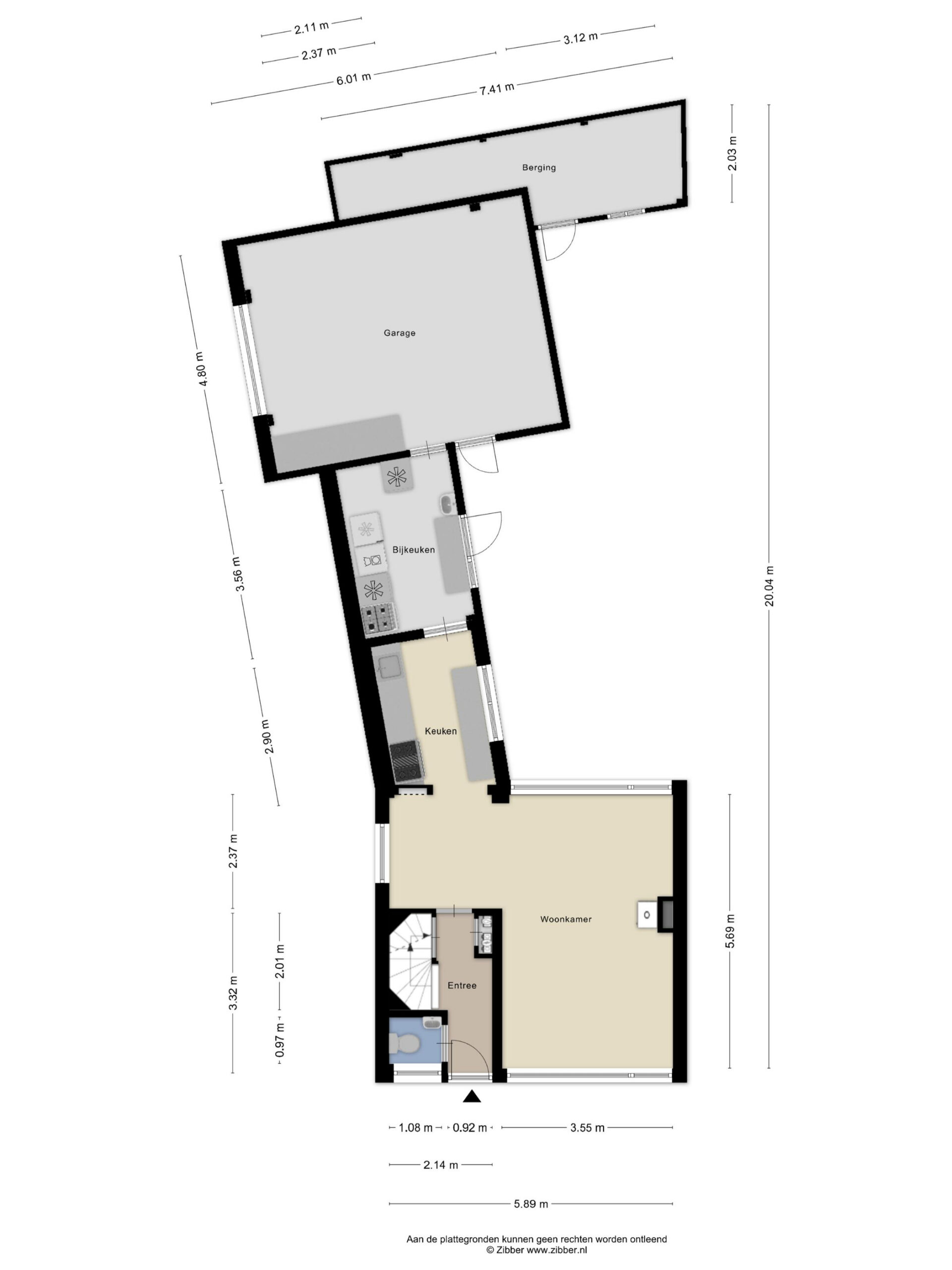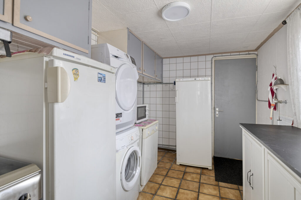 Indeling: entree/hal met toilet, trapkast en trapopgang; L vormige doorzonwoonkamer; halfopen keuken met keukenopstelling die voorzien is van gasfornuis, afzuigkap, oven en vaatwasser; bijkeuken met plavuizen vloer en witgoedaansluitingen; aangebouwde garage (binnendoor bereikbaar)