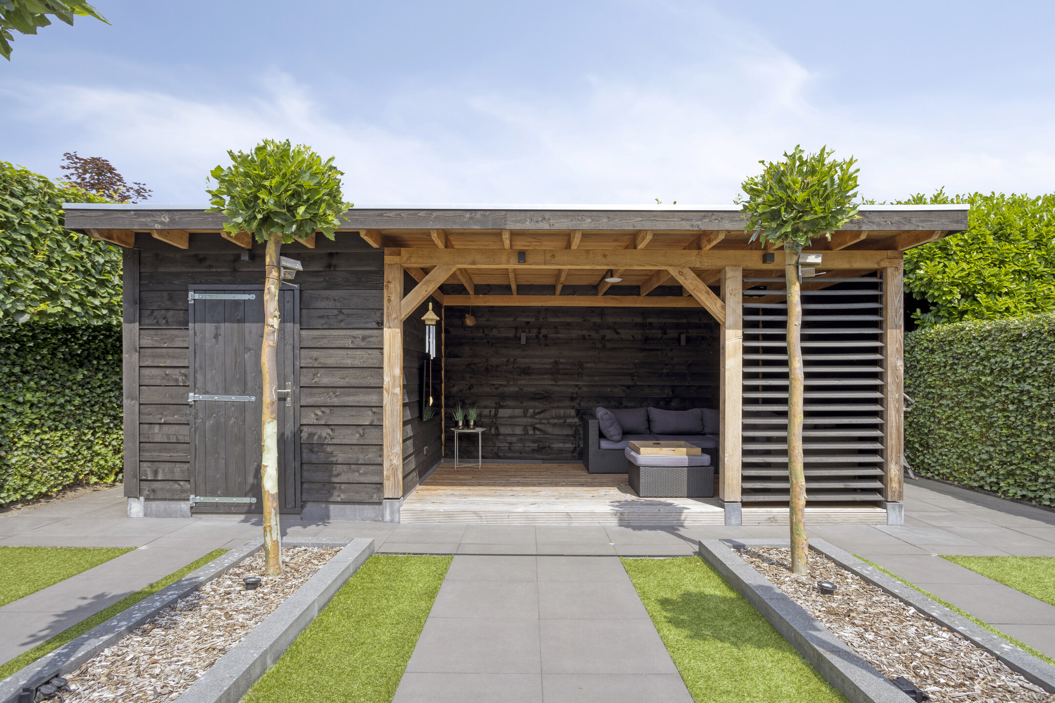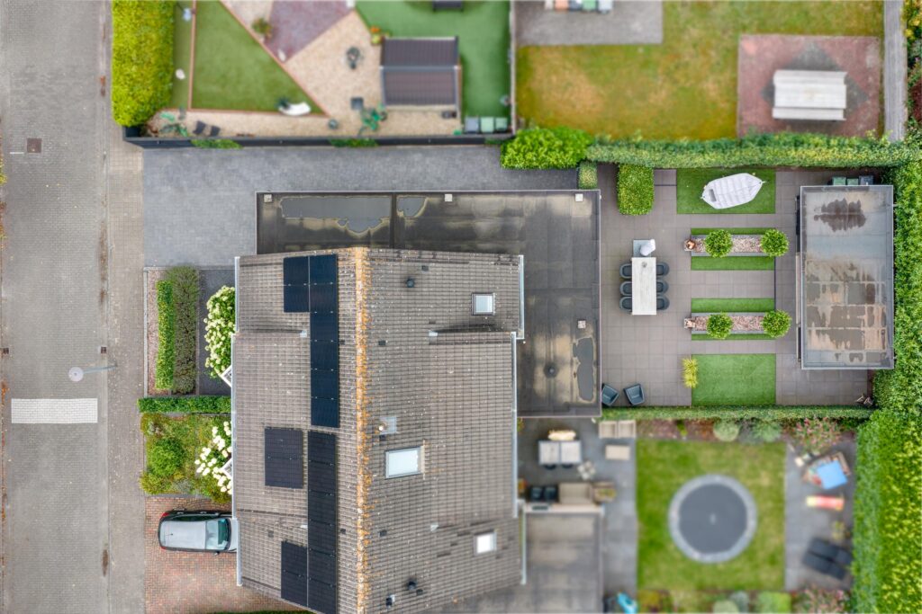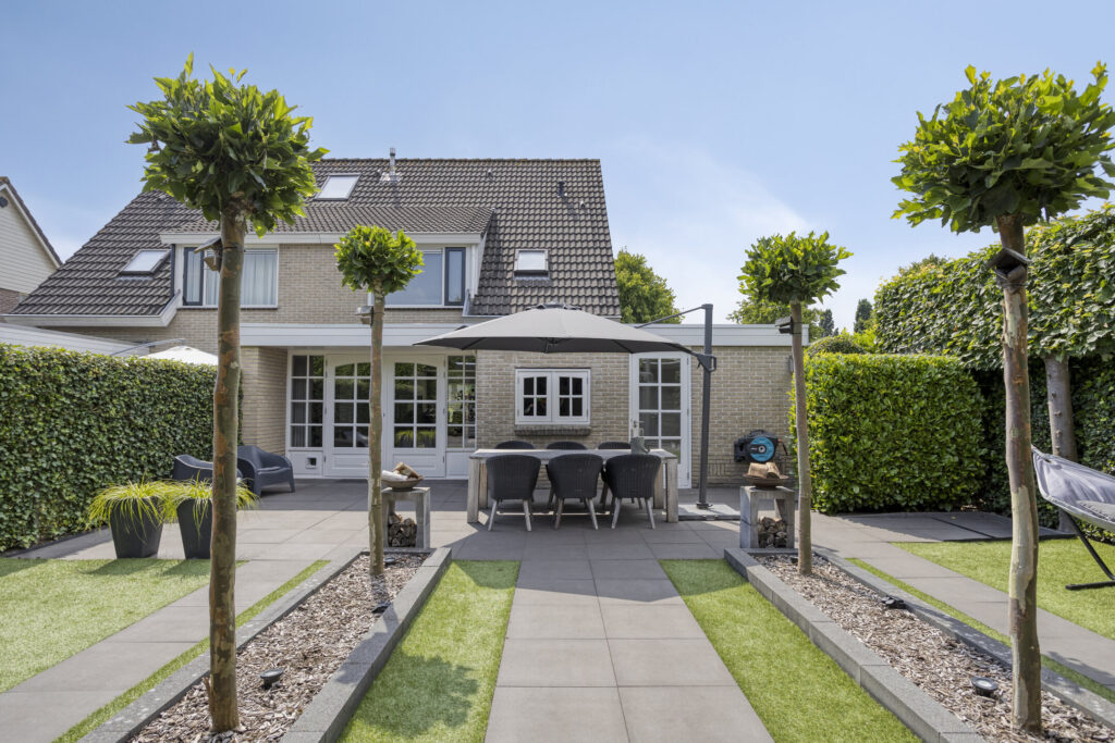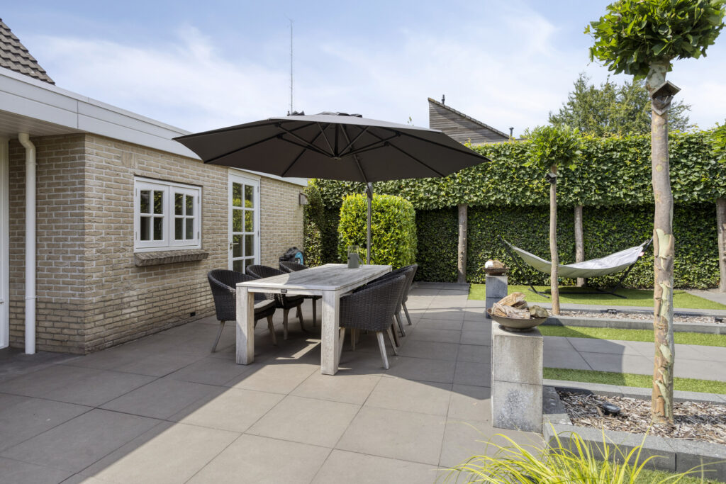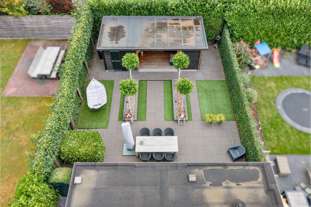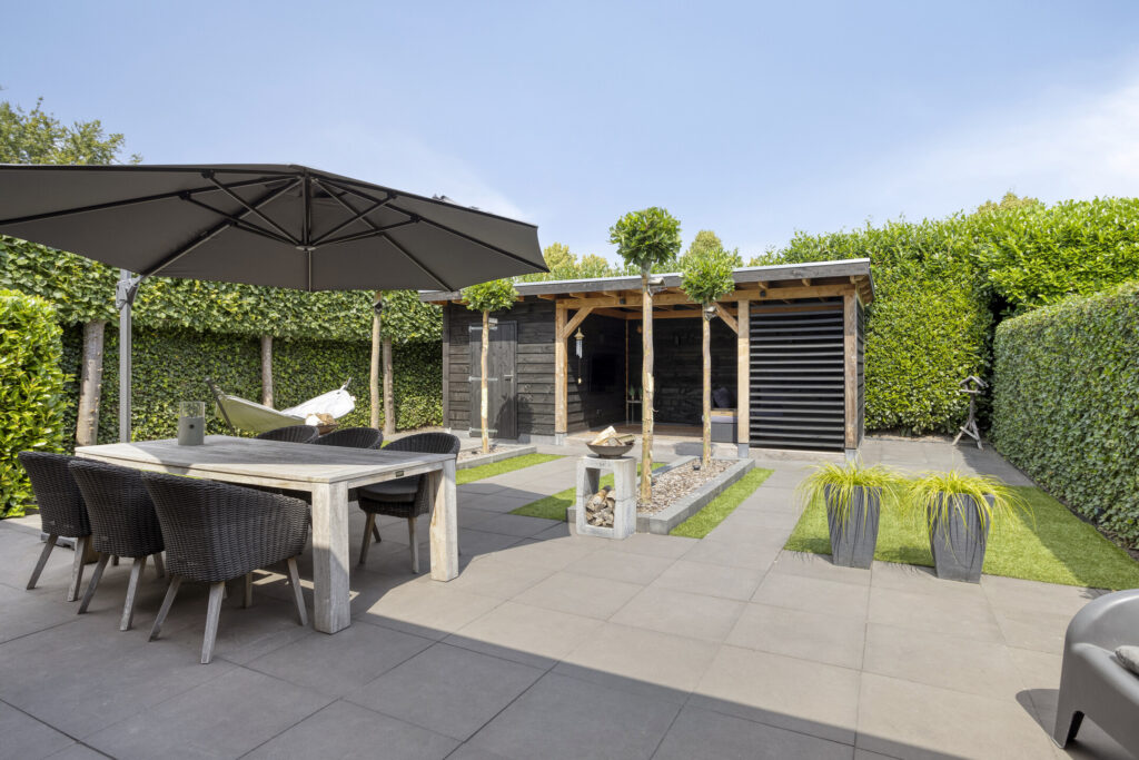 De fraai aangelegde tuin op het zuidoosten is een waar buitenparadijs. Dankzij de praktische indeling kun je op elk moment van de dag van de zon genieten. Achterin de tuin vind je een ruime, vrijstaande houten berging met terrasoverkapping – perfect voor lange zomeravonden of hobbyruimte.