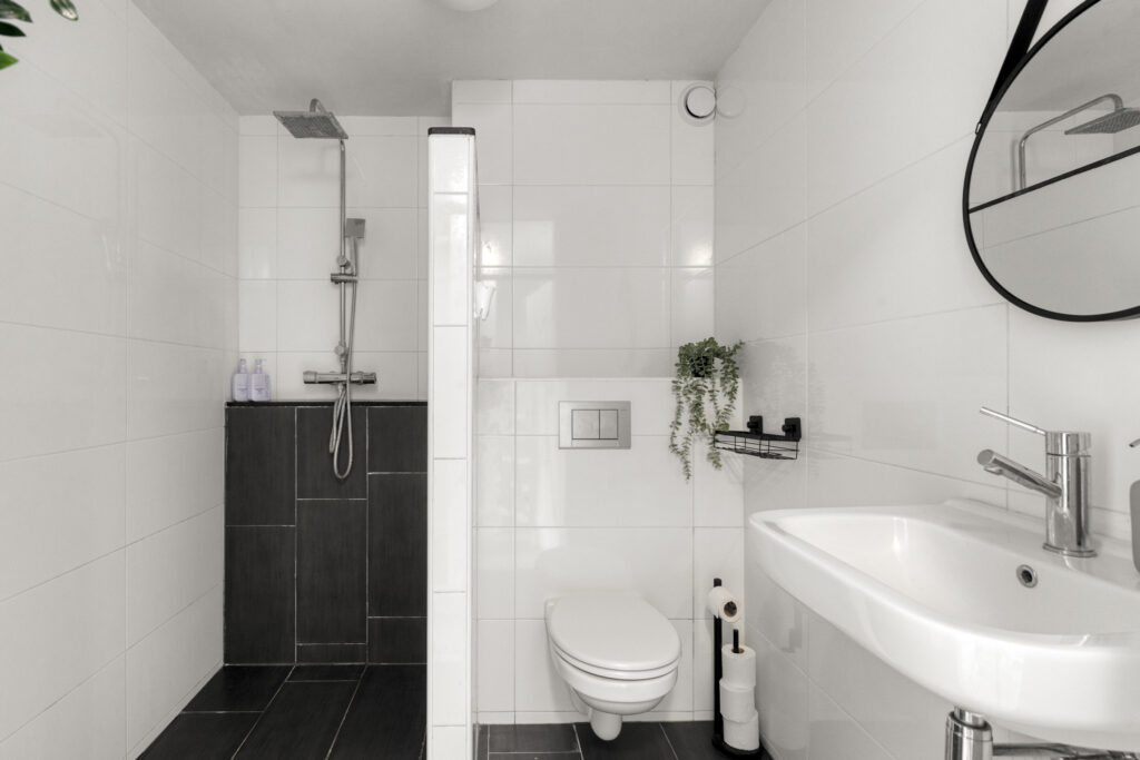 Eerste verdieping: overloop; twee slaapkamers; eigentijdse badkamer met inloopdouche, wastafel en toilet.