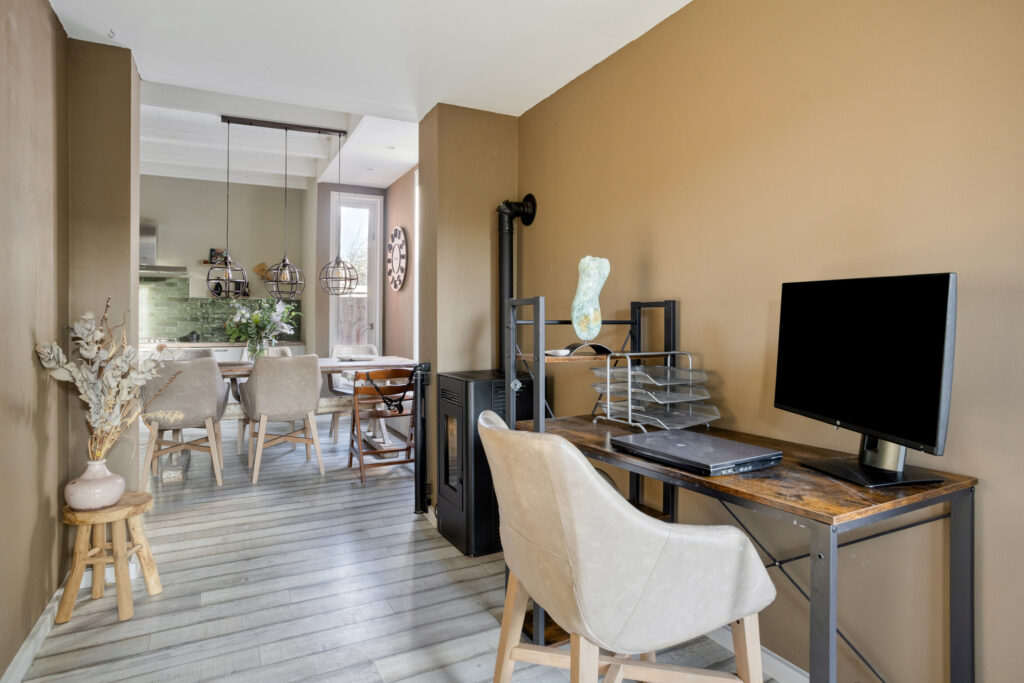 Begane grond: voorentree/hal met toegang naar de kelder; ruime woonkamer houtkachel; woonkeuken met keurige inbouwkeuken voorzien van gasfornuis, afzuigkap, combioven, koelkast, vriezer en vaatwasser; werkplek met pelletkachel en deuren naar de tuin; badkamer voorzien van ligbad en vaste wastafel; tussenhal met witgoedaansluiting en toilet; slaapkamer.