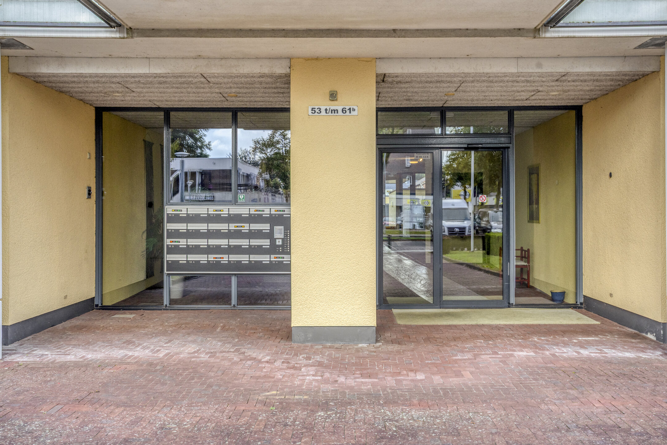 Begane grond: portiek met brievenbussen; centrale hal met toegang naar liftinstallatie en trappenhuis.