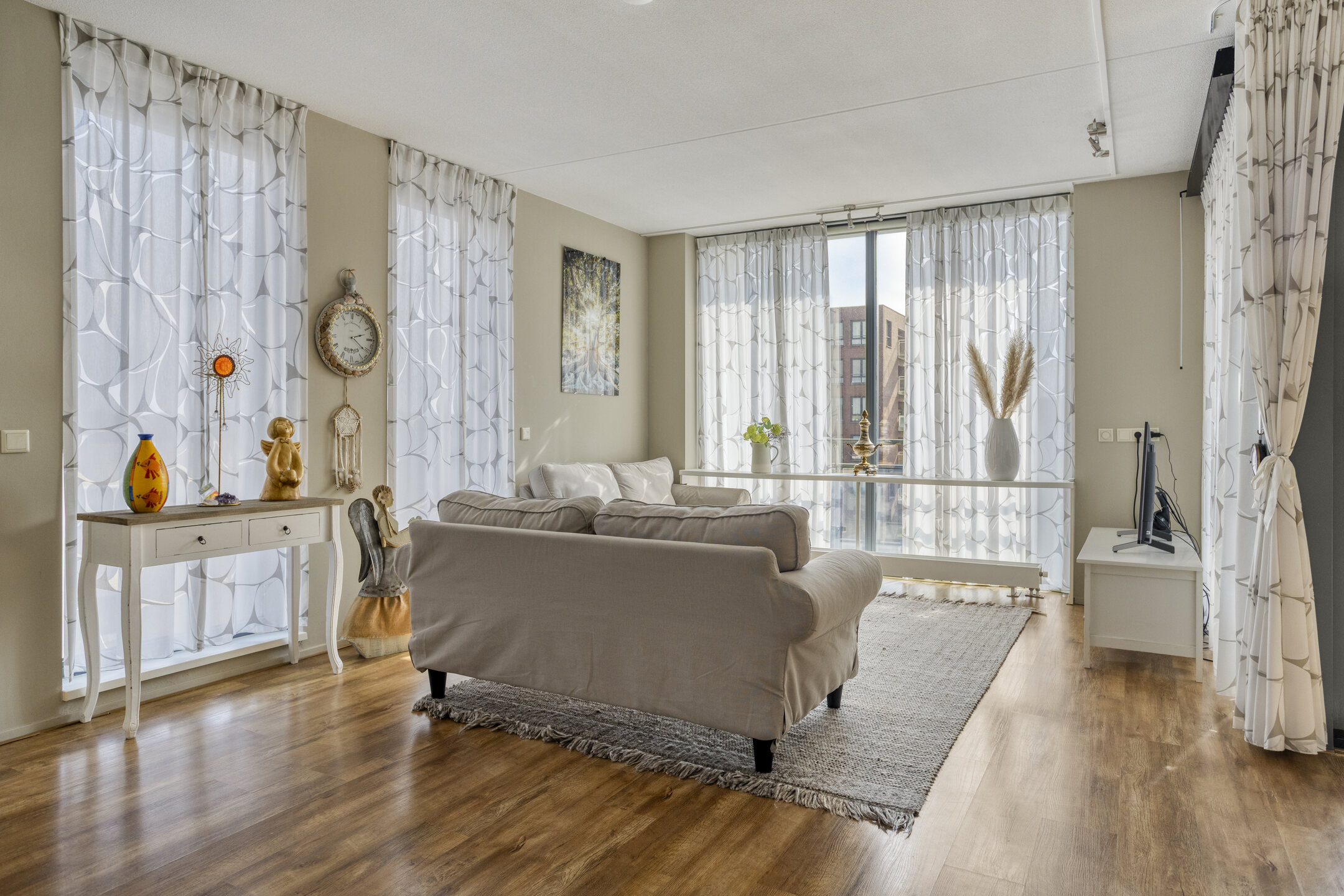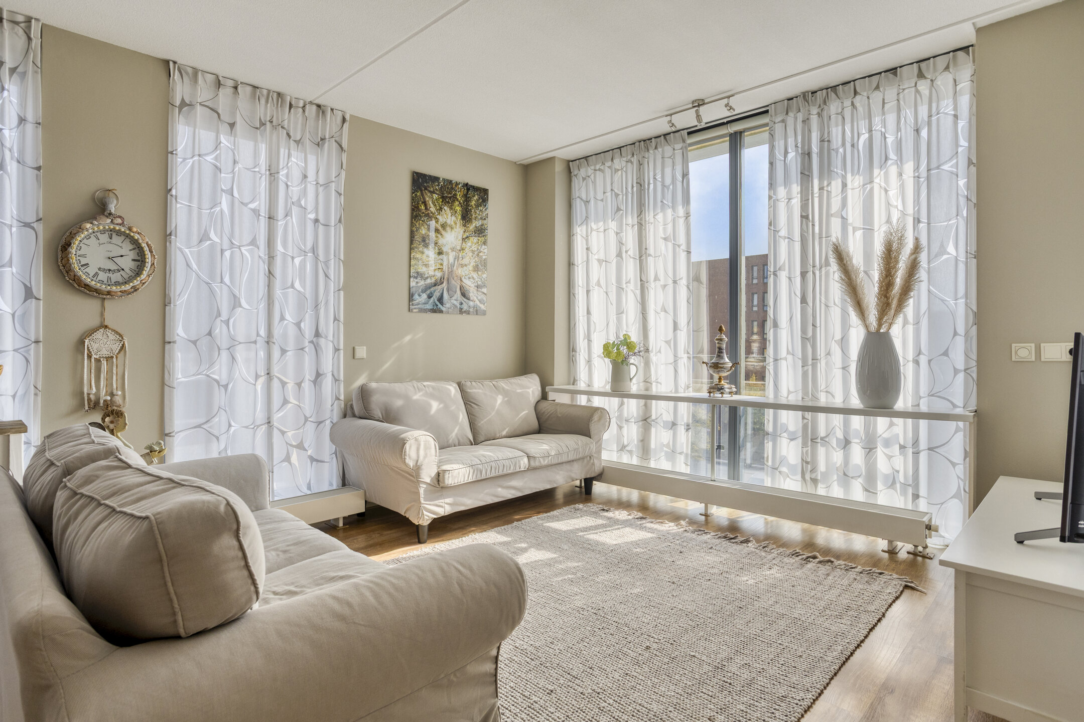 In een statig en uitstekend onderhouden appartementencomplex bevindt zich dit fraaie hoekappartement (nummer 59D), dat direct opvalt door zijn royale lichtinval dankzij ramen aan zowel de voor- als de zijgevel. Vanuit de ruime en lichte woonkamer stap je zo het zonnige balkon op, waar je geniet van een vrij uitzicht. Op de begane grond bevindt zich een ruime privégarage, groot genoeg voor een auto én extra opbergruimte. Het terrein is volledig omsloten en wordt veilig afgesloten met een elektrisch bedienbaar hekwerk.