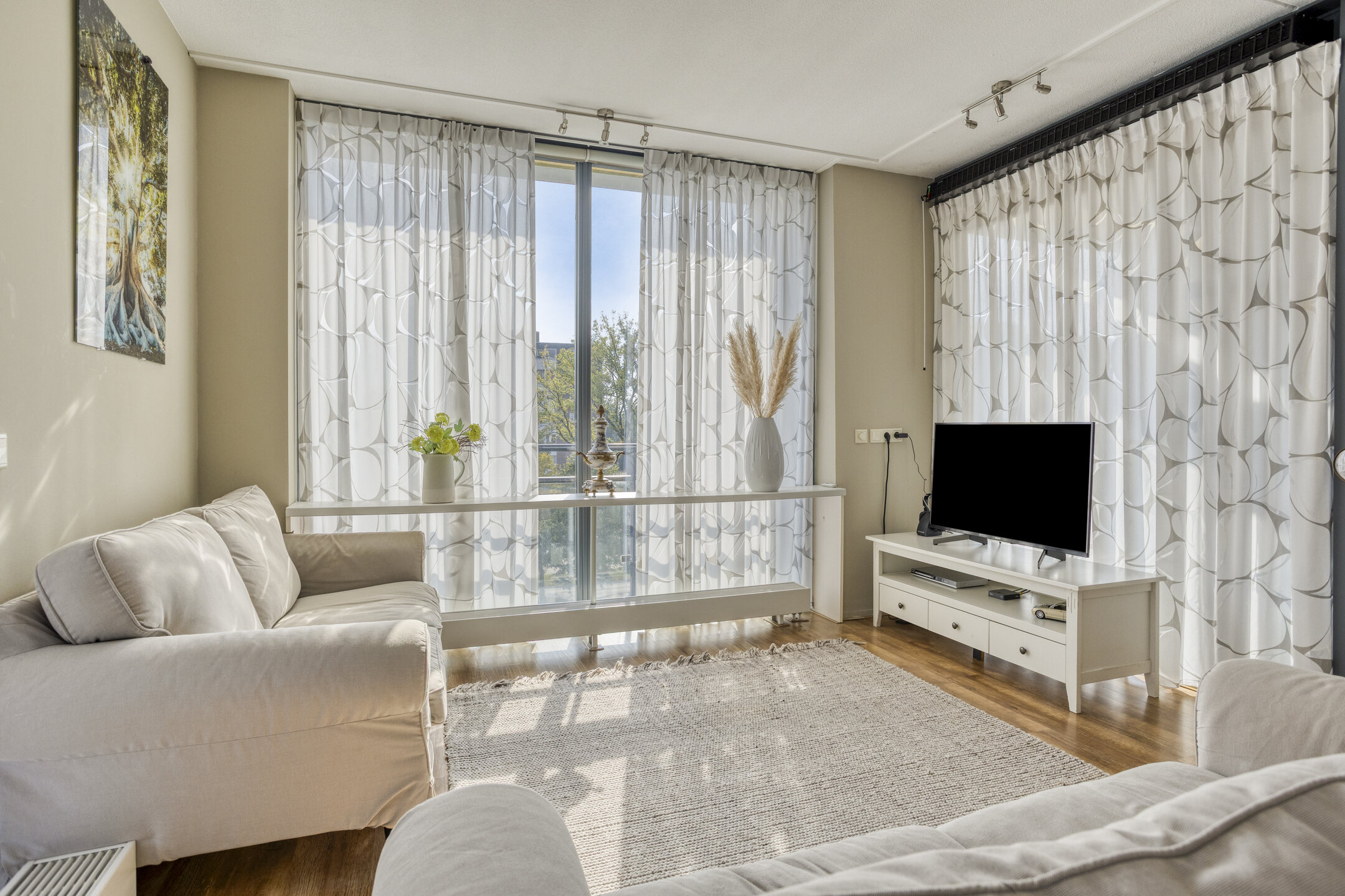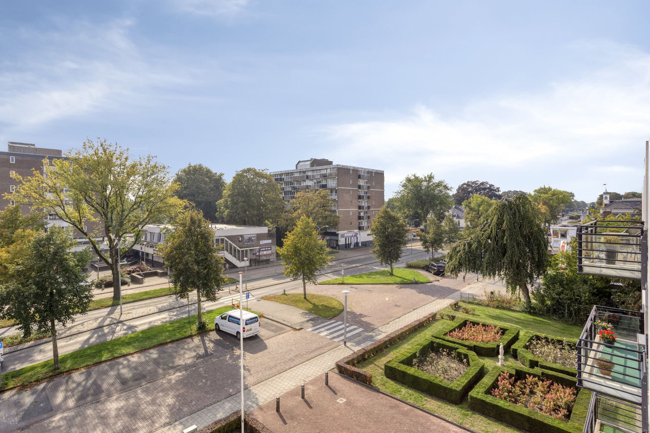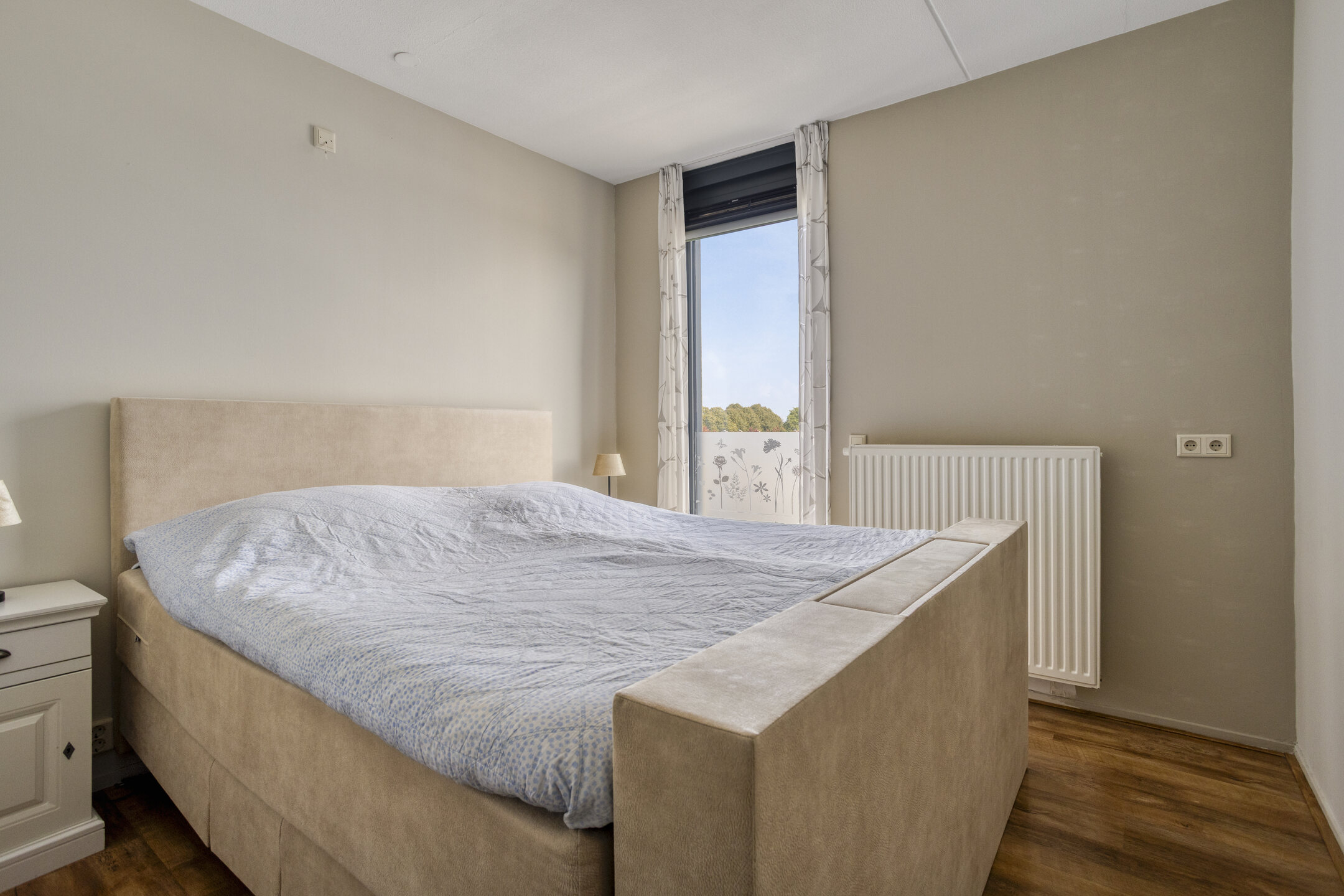 - elektrisch, vanuit de woonkamer bedienbare zonwering aan de raam voorzijde;