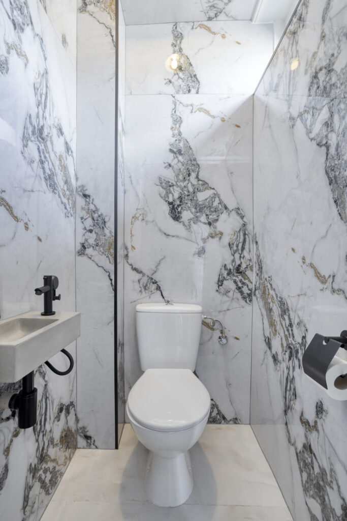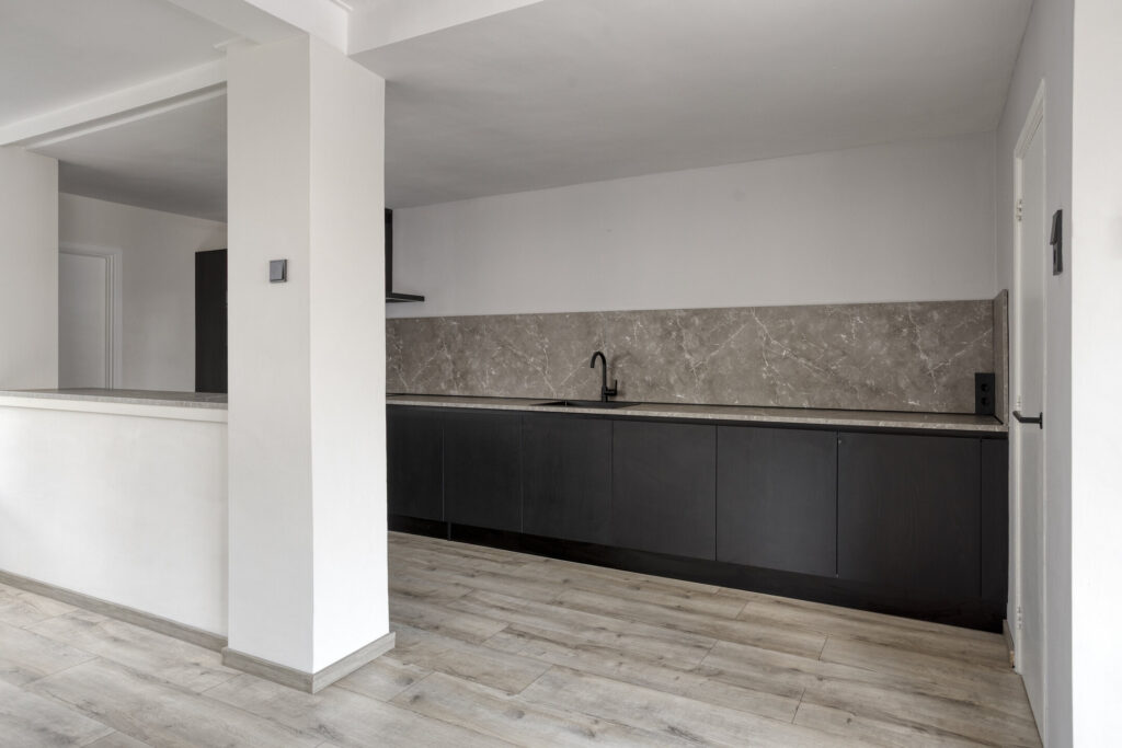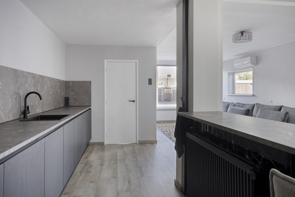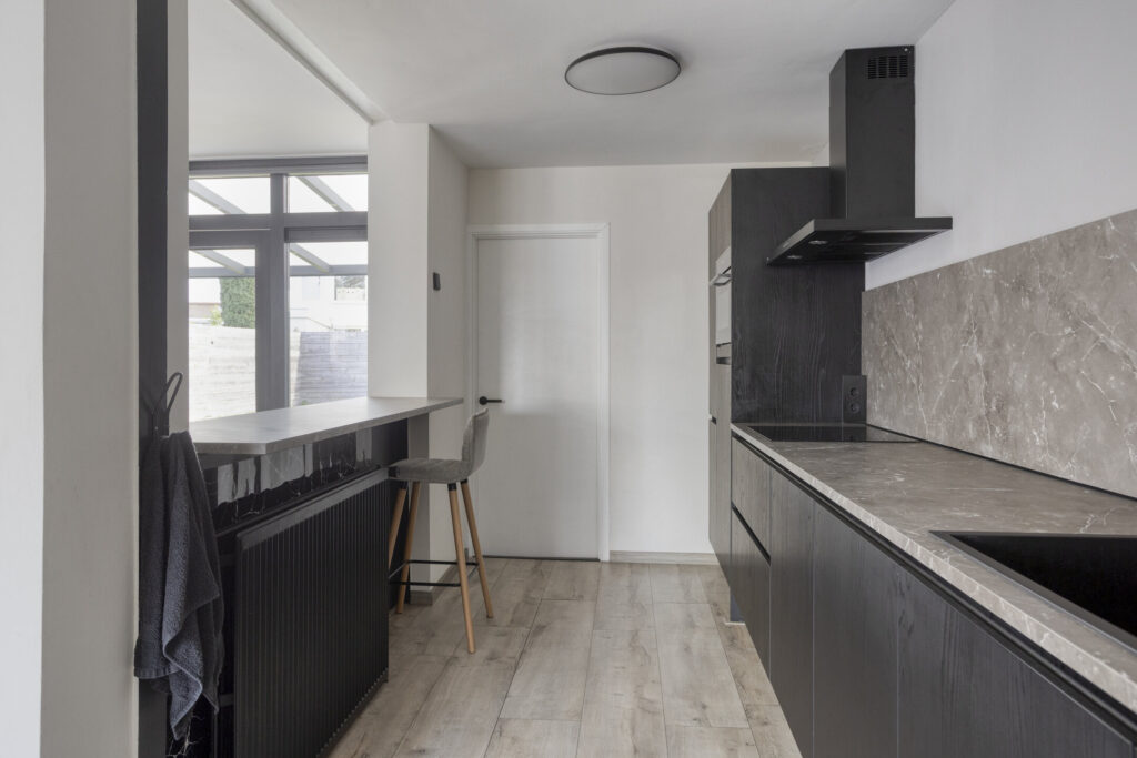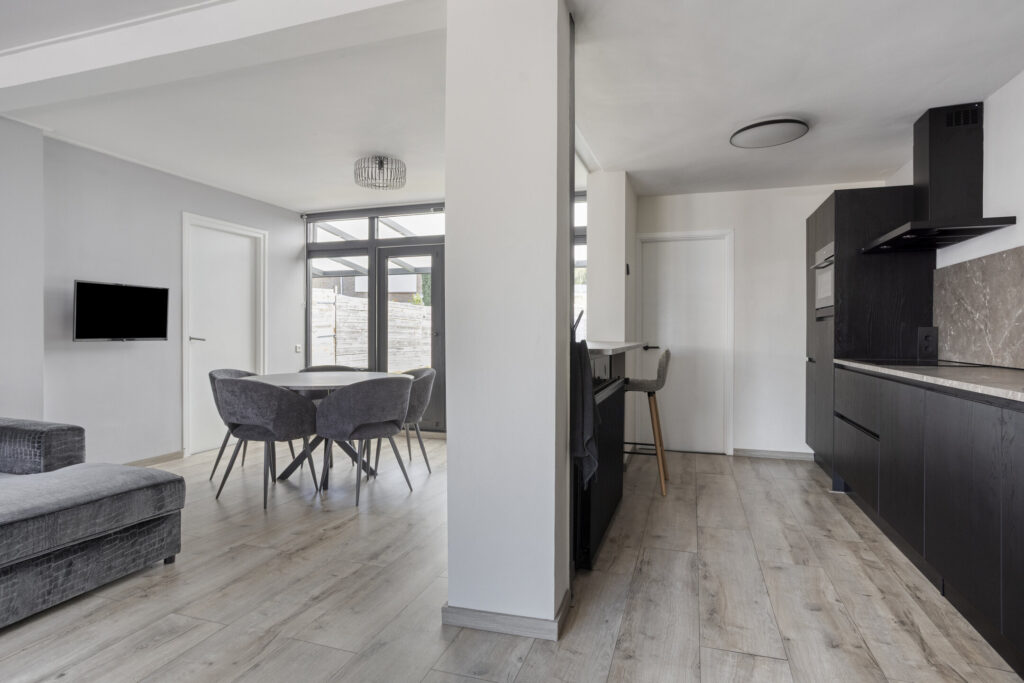 Indeling: entree; hal met modern toilet en kelderkast; uitgebouwde doorzonwoonkamer met tuindeuren naar terras; half open keuken in rechte opstelling die voorzien is van inductiekookplaat, afzuigkap, koelkast, vaatwasser en combi-oven;