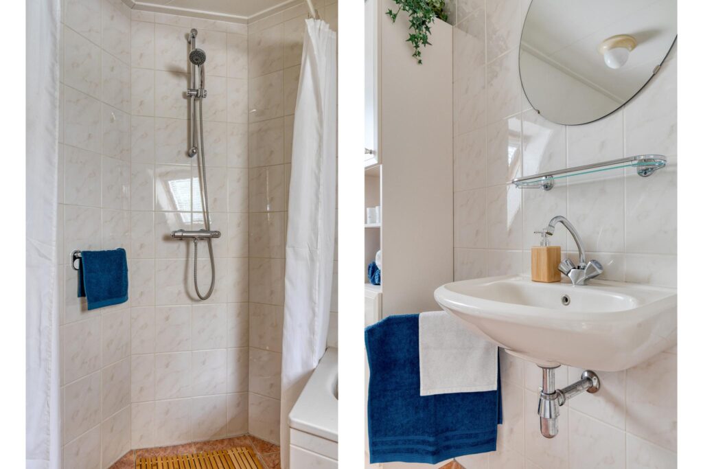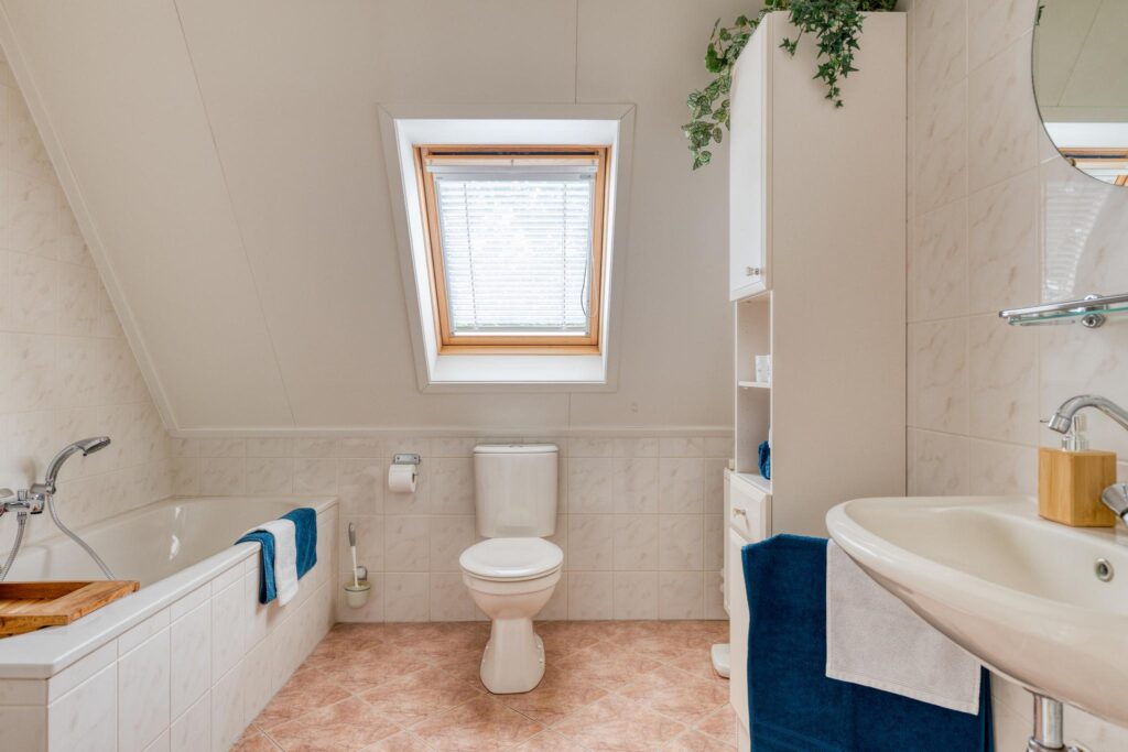 Eerste verdieping: overloop; drie slaapkamers; badkamer met douche, ligbad, spiegel, wastafel, toilet en dakraam voorzien van luxaflex jaloezieën.