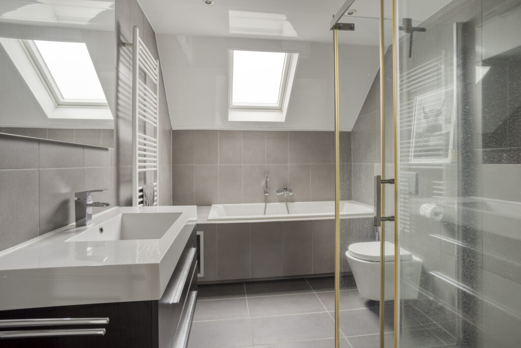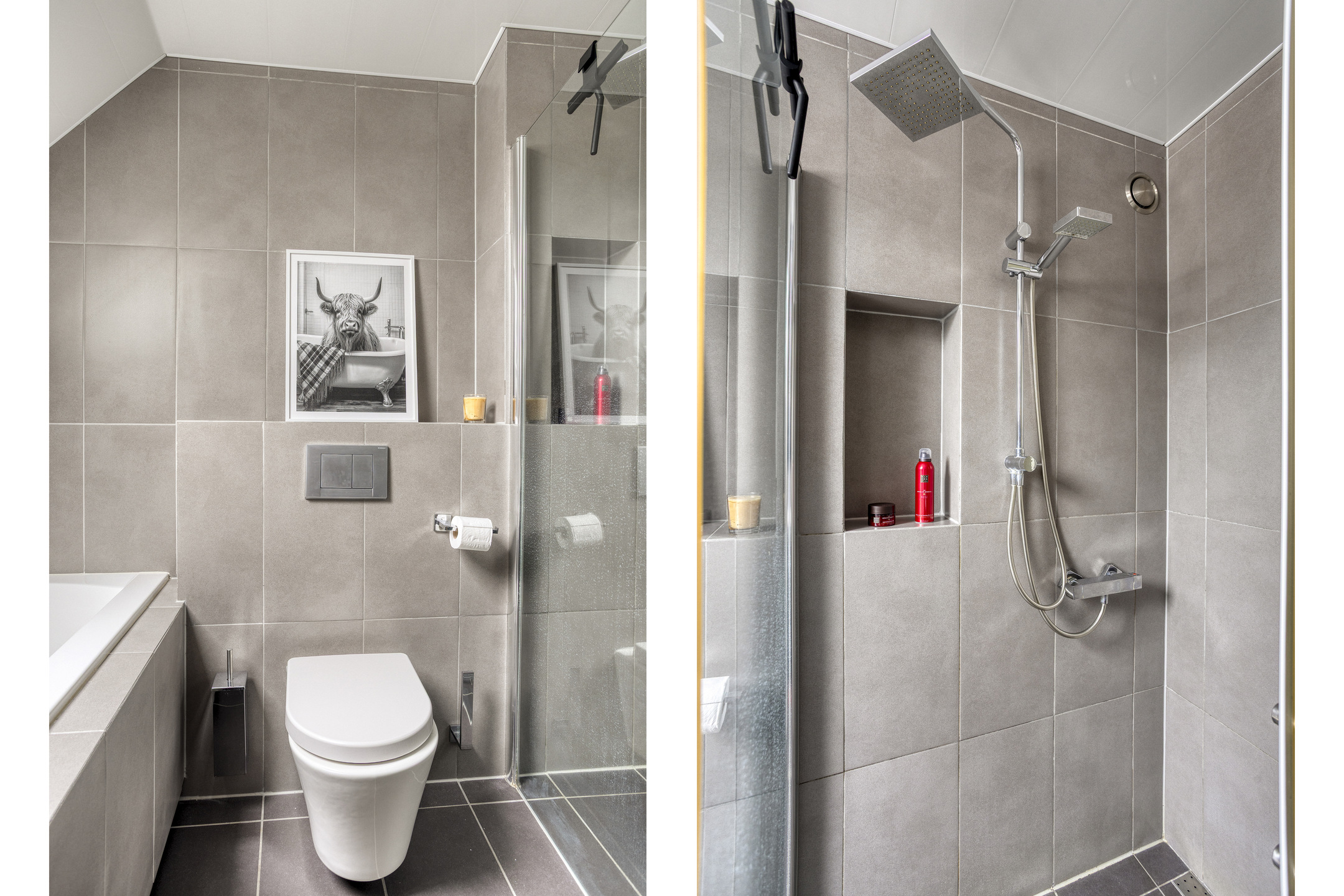 Eerste verdieping: overloop; drie ruime slaapkamers; eigentijdse badkamer met ligbad, douche, wastafelmeubel en toilet.