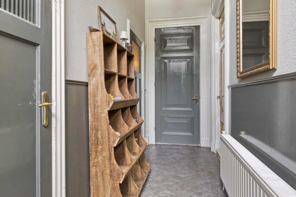 Begane grond: uitnodigende entree; ruime hal; een multifunctionele slaap-/studeerkamer; sfeervolle woonkamer met authentieke plafonddetails en veel lichtinval; een open woonkeuken met moderne keukenopstelling (2013); praktische provisiekast met cv-opstelling en toegang tot de kelderruimte; gang; royale badkamer met ligbad, dubbele wastafel en douche; een ruim toilet met witgoedaansluiting; bergruimte en trapopgang.